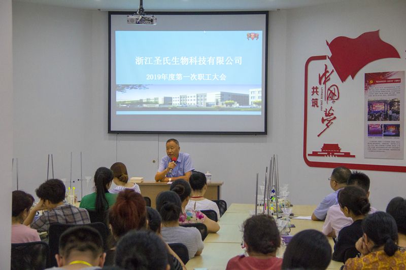 7月22日,浙江圣氏生物科技有限公司2019年度第一次職工大會在行政樓一樓大教室如期召開。大會由董事長胡林福主持并發(fā)言,公司全體職工參加。會議主要對當(dāng)前的經(jīng)濟(jì)形勢和管理現(xiàn)狀進(jìn)行分析;明確未來發(fā)展方向;調(diào)整公司相關(guān)制度;并對公司對全體員工提出工作要求 。