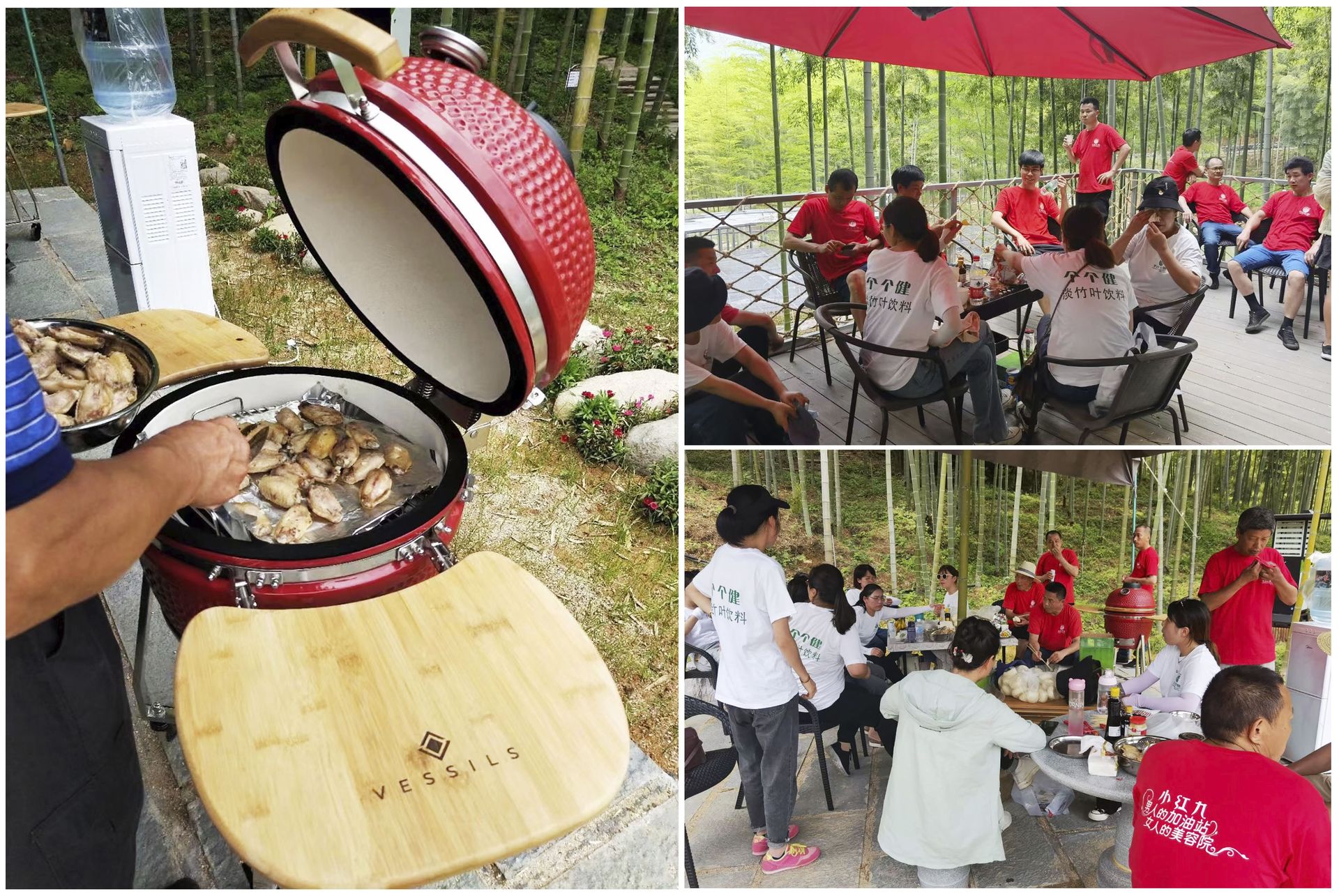 團(tuán)建活動(dòng)結(jié)束后,有三五個(gè)伙伴一起騎上一輛觀光自行車前往的,也有跟隨余村景區(qū)講解員一起步行前往的,來(lái)到“林下經(jīng)濟(jì)觀光區(qū)”里一起“竹林燒烤”的午餐時(shí)光。大家圍著燒烤爐子,彼此間相互學(xué)習(xí)燒烤經(jīng)驗(yàn),或討論著上午的團(tuán)建拓展活動(dòng)的細(xì)節(jié),或欣賞這竹林間的片片美景……你嬉我笑,歡聲笑語(yǔ)縈繞在半空,同事間的情誼隨著陣陣香味逐漸升華。