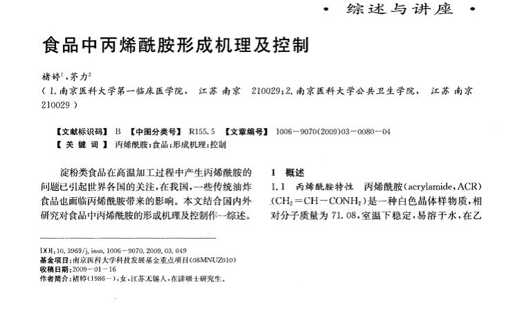 一、食品中國(guó)丙烯酰胺形成機(jī)理目前為止,由天冬酰胺和還原性糖在高溫加熱過(guò)程中通過(guò)美拉德反應(yīng)(Maillardreaction)生成丙烯酰胺的途徑是較為公認(rèn)的形成途徑,國(guó)內(nèi)外對(duì)此研究也較多。二、食品中丙烯酰胺形成的影響因素高溫中丙烯酰胺生成受多種因素的影響,如加工溫度和時(shí)間、還原糖盒游離氨基酸種類(lèi)及含量、游離氨基酸與還原糖的摩爾比、褐變程度、PH值、食品含水量等。三、控制食品中丙烯酰胺的方法1-減少食…