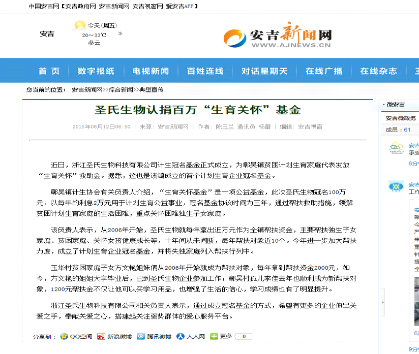 近日,浙江圣氏生物科技有限公司計(jì)生冠名基金正式成立,為鄣吳鎮(zhèn)貧困計(jì)劃生育家庭代表發(fā)放“生育關(guān)懷”救助金。據(jù)悉,這也是該鎮(zhèn)成立的首個(gè)計(jì)劃生育企業(yè)冠名基金。鄣吳鎮(zhèn)計(jì)生協(xié)會有關(guān)負(fù)責(zé)人介紹,“生育關(guān)懷基金”是一項(xiàng)公益基金,此次圣氏生物冠名100萬元,以每年的利息2萬元用于計(jì)劃生育公益事業(yè),冠名基金協(xié)議時(shí)間為三年,通過幫扶救助措施,緩解貧困計(jì)劃生育家庭的生活困難,重點(diǎn)關(guān)懷困難獨(dú)生子女家庭。該負(fù)責(zé)人表示,從2…