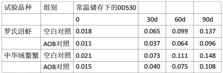 將捕撈后的羅氏沼蝦和中華絨螯蟹分別放入清水池中暫養(yǎng)20~24h(增氧),在暫養(yǎng)水中加入0.015%的AOB,在吐納消化道內(nèi)殘留物的同時,蝦、蟹體內(nèi)攝入一定量的AOB抗氧成分。將完成暫養(yǎng)后的蝦、蟹加工成軟罐頭,分別進行常溫和低溫保藏以及高溫促氧化實驗,在暫養(yǎng)水中添加AOB顯著增強了制品的抗氧化能力,成品的色澤保持性能明顯好于對照(p<0.05),并有效抑制了蝦紅(青)素的氧化褪色和蝦頭的氧化變黑;在35±1oC的保藏實驗中胖袋率顯著降低(p<0.05),表現(xiàn)出一定的抑菌保鮮效果。軟罐頭常溫儲存3個月后,蝦蟹肌肉勻漿中丙二醛(MDA)的含量顯著低于空白對照。如下表所示: